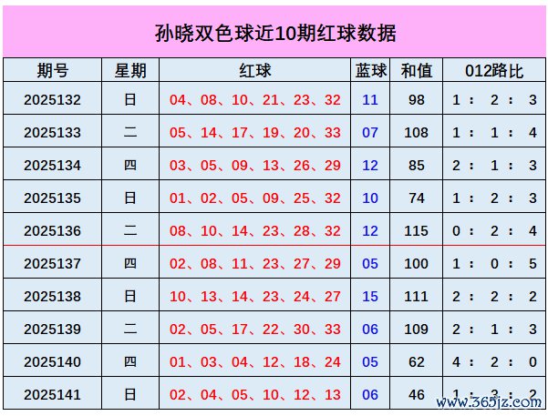 上期追思:双色球第2025141期开出奖号:红球02、04、05、10、12、13;蓝球06,其中红球和值为46,012路比为1:3:2,奇偶比2:4,蓝球开出小偶数号码06。