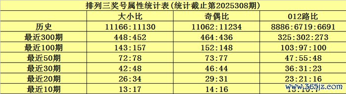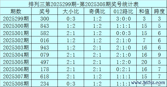 上期归来:成列三第2025308期奖号为234,奖号012路比为1:1:1,奇偶比为1:2,大小比为0:3,和值为9,跨度为2。