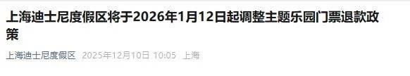 上海迪士尼度假区官方微信号12月10日晓谕,将于2026年1月12日起优化上海迪士尼乐土门票退改战略。