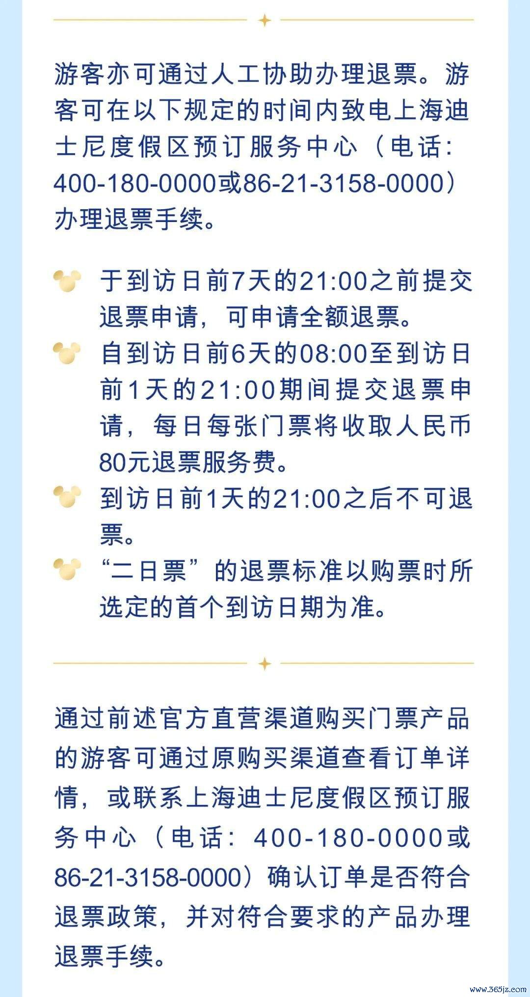 新退票门径为通过前述官方直营渠说念购买乐土门径门市价“一日票/二日票”、迪士尼妙游一日套票的搭客,于到访日前7天的23:59(含)之前提交退票央求,可央求全额退票;自到访日前6天的00:00至到访日前1天的23:59(含)时辰提交退票央求,逐日每张门票将收取东说念主民币80元退票就业费;到访日当日00:00之后不行退票;“二日票”的退票门径以购票时所选择的首个到访日历为准。
