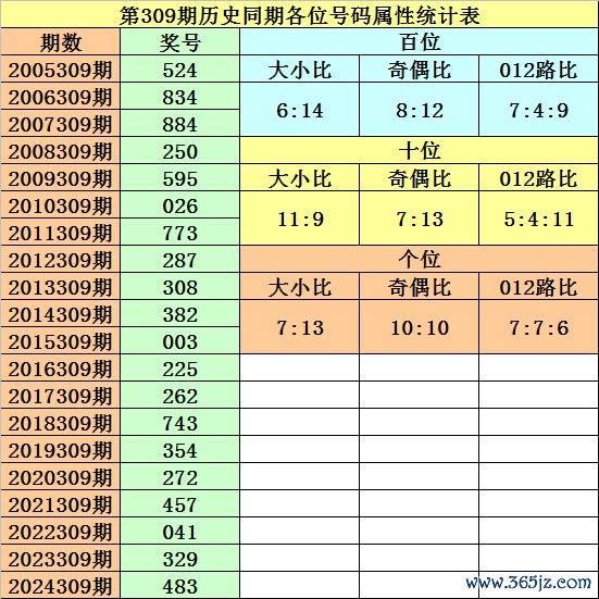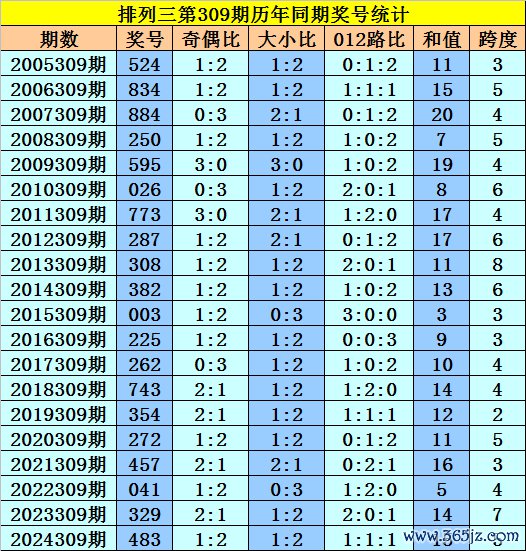 开奖回顾:胪列三第2025308期开出奖号234,奖号012路比为1:1:1,大小比为0:3,奇偶比为1:2,最近三年第309期同期开出奖号为:第2022309期:041、第2023309期:329、第2024309期:483。